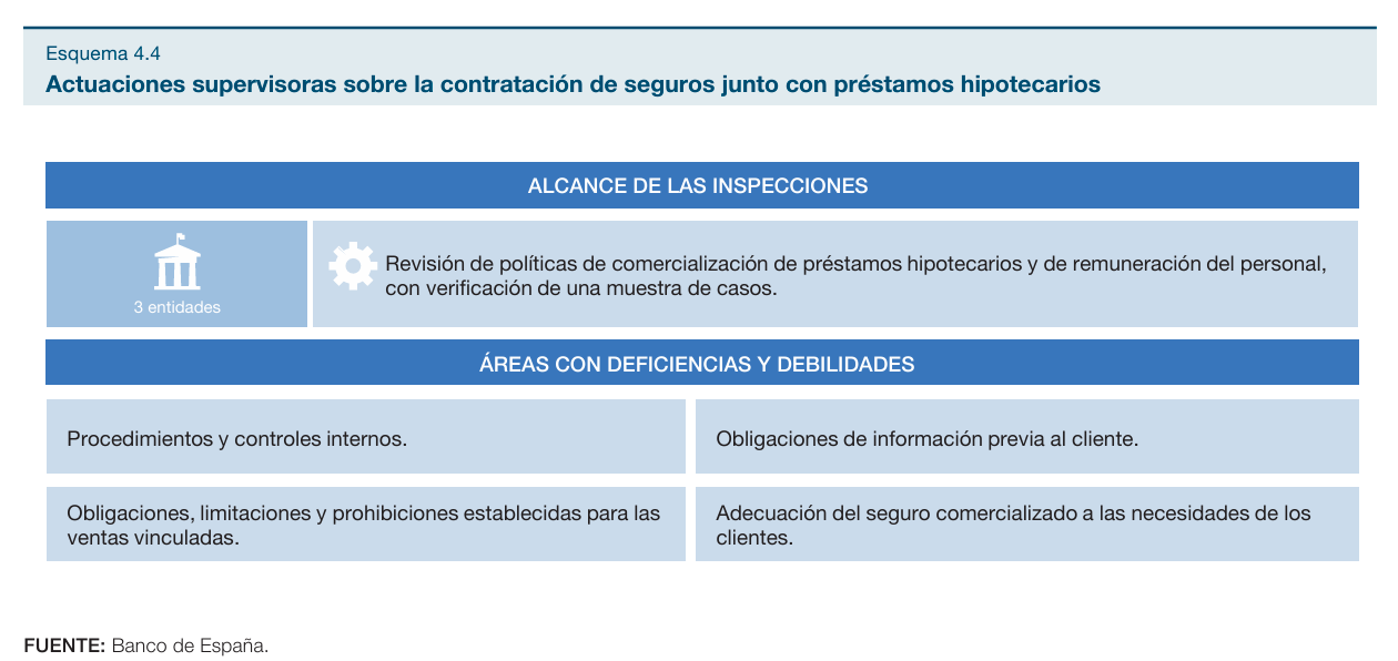 El Banco de España ha publicado su Memoria de Supervisión del pasado año y en ella también hace referencia a algunas actividades de supervisión donde están los seguros implicados. Indica el organismo que realizó estas actuaciones como parte de la prioridad relativa a las prácticas competitivas y al comportamiento estratégico de algunas entidades. El fin de las mismas era "analizar la comercialización de seguros junto con las operaciones de préstamo hipotecario".