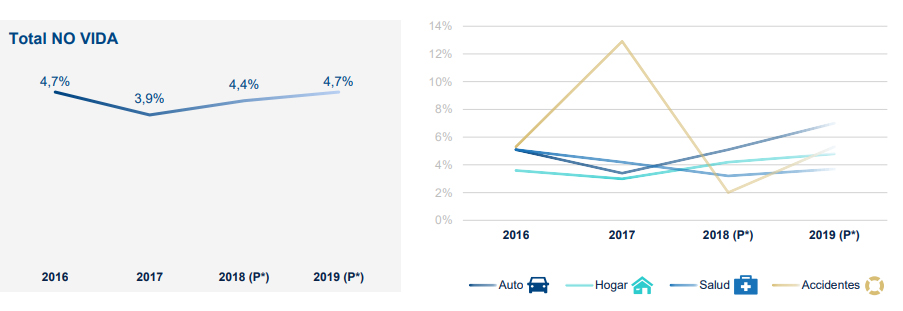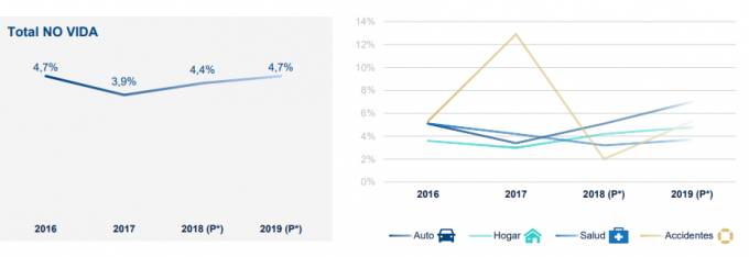 No Vida experimentará un incremento del 4,4% en 2018 y del 4,7% en 2019. Desglosado por ramos, Autos aumentará un 5,1% en 2018 y un 7% en 2019 por el incremento de las ventas de vehículos; Hogar, un 4,3% y un 4,8%, respectivamente, debido a la recuperación del mercado inmobiliario; Salud, desacelerará su recaudación hasta el 3,2% en 2018 y volverá a repuntar en 2019 hasta el 3,7%; y Accidentes, aminorará su crecimiento hasta el 2% en 2018 y se impulsará en 2019 con un incremento del 5,3%.