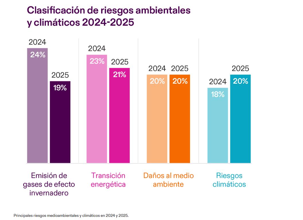 Sobre la implicación normativa de esas cuestiones de sostenibilidad, el 19% de los empresarios con sede en España han seleccionado el incumplimiento de los nuevos requisitos ESG como su principal preocupación este año, por debajo del 22% en 2024.