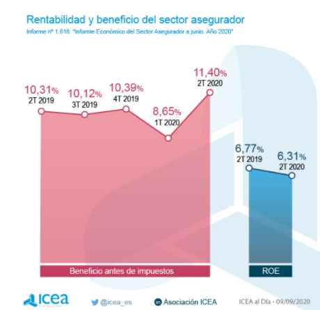 ICEA ha dado a conocer que durante el primer semestre el beneficio antes de impuestos conjunto del sector asegurador sobre primas imputadas se situó en el 11,4%. Este dato supone que, a pesar de la crisis del Covid, hasta junio el seguro español mejora su beneficio 1,1 pp respecto al mismo periodo del año anterior.