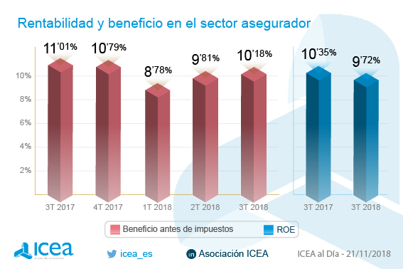 Los datos de ICEA muestran que el beneficio antes de impuestos sobre primas imputadas de las aseguradoras españolas fue del 10,18%. Se redujo en 0,83 p.p. respecto al registrado en el tercer trimestre de 2017. La rentabilidad sobre recursos propios (ROE) fue del 9,72%, lo que supone un decremento de 0,63 p.p. sobre el mismo periodo del año anterior.