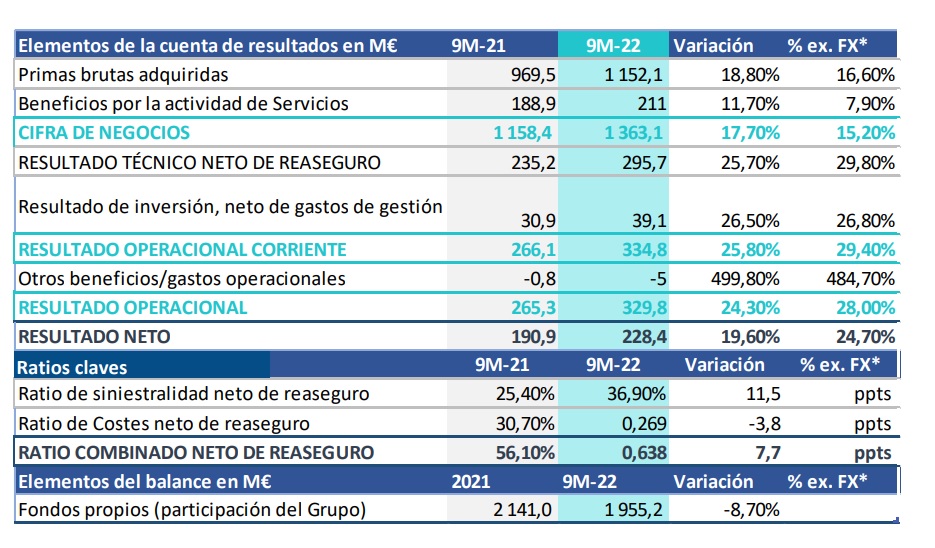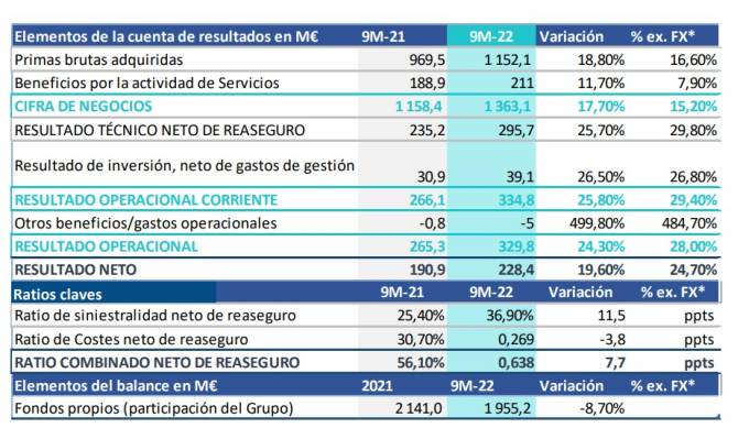 Ratio de siniestralidad neta del 36,9% en 9 meses, con un aumento de 11,5 puntos porcentuales; ratio combinado neto a 63,8%, con un aumento de 7,7 puntos porcentuales.