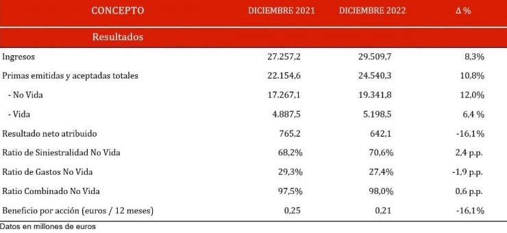 Al cierre del pasado ejercicio el ratio combinado aumentó en 0,6 puntos porcentuales y se situó en el 98%, "afectado por el incremento de siniestralidad de Automóviles, consecuencia de las altas tasas de inflación y el incremento de la movilidad tras la eliminación de las restricciones por el Covid", indica Mapfre.