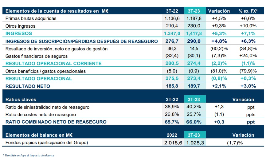 El ratio de siniestralidad neta del 40,2%, con un aumento de 1,3 puntos porcentuales; ratio combinado neto a 66,8%, con un aumento de 3,3 puntos porcentuales (+0,3 puntos porcentuales con respecto al tercer trimestre de 2022).