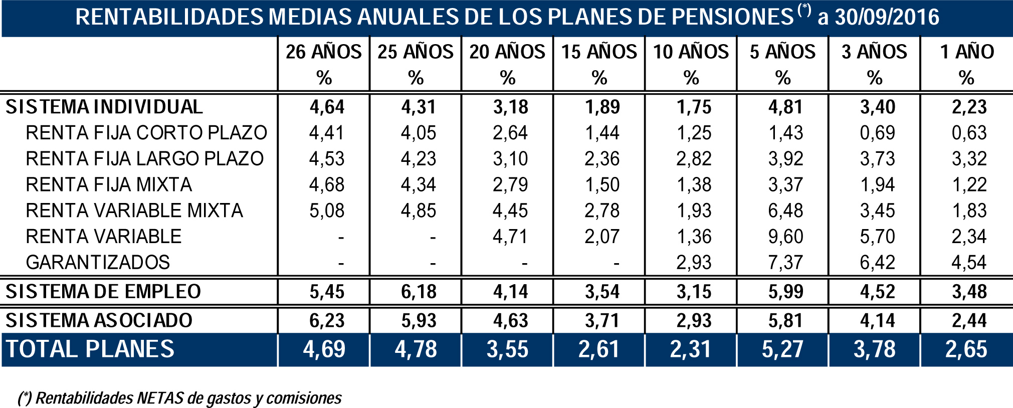 Garantizados y 3,3% en Renta Fija Largo Plazo. Para el conjunto de Planes de Pensiones, la rentabilidad media anual neta de comisiones y gastos se coloca en el 2,6%. En el largo plazo, a 26 años, la rentabilidad media anual alcanza el 4,7% para el total de Planes. En el medio plazo (5 y 10 años), presentan una rentabilidad media anual del 5,3% y 2,3% anual.