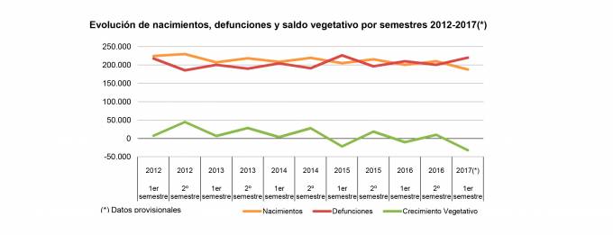 El problema es que el denominado crecimiento vegetativo de la población, la diferencia entre nacimientos y defunciones, fue de –32.132 personas en los seis primeros meses de 2017. Esta cifra es más negativa que la del mismo periodo de 2016 (–10.145) debido, sobre todo, a la mayor mortalidad registrada este año.