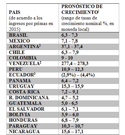 El informe también ha elaborado el Índice de Evolución del Mercado (IEM) donde ha hecho unas previsiones del comportamiento del sector asegurador para este 2016 en moneda local. Únicamente Ecuador registraría resultados negativos en base a las previsiones económicas realizadas por el Fondo Monetario Internacional. La caída oscilaría entre el 2,9% y el 4,4%. Brasil seguiría liderando la región y obtendría crecimientos de entre el 6,3% y el 7,3%; caso similar sería México con una mejora estimada de hasta el 7,8%. Para Argentina y Venezuela se estiman crecimientos muy abultados aunque en ambos casos hay que tener en cuenta que cuenta con una amplia inflación.