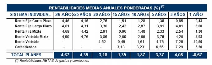 Inverco señala que el largo plazo, los Planes de Pensiones siguen generando rendimientos positivos: a 26 años, el 4,67%; en el medio plazo, 5 y 10 años, rentabilidad del 3,37% y 1,87% anual, respectivamente.