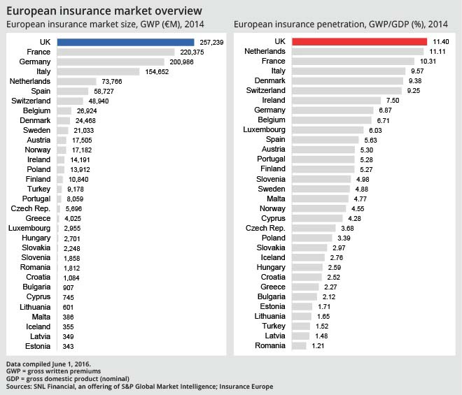 El 23 de junio se vota en Reino Unido el Brexit, su salida de la UE, y los sondeos vaticinan un resultado muy ajustado. Los riesgos políticos o reglamentarios no son los que más preocupan, sino los macroeconómicos. Y un sector que podría ver muy limitada su evolución es el asegurador, ya que el Brexit impediría a las aseguradoras británicas acceder a un mercado de 500 millones de personas de la UE, según S&P Además, en otros países de la UE las aseguradoras británicas comercializan cerca de 21.000 millones de libras en seguros y productos de ahorro a largo plazo, por lo que una importante parte de su negocio se vería afectada.
