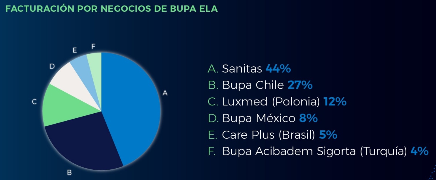 De ese total, Sanitas aportó el 44% mientras que el 56% restante procede de los negocios fuera de España. En concreto, Bupa Chile fue la filial que más contribuyó al volumen de ingresos de esta unidad después de España (27%), por delante de Lux Med en Polonia (12%), que está a un paso de hacerse con el control de Swissmed, y Bupa México (8%), que se ha visto favorecida por su alianza con BBVA y por la adquisición de Vitamédica.