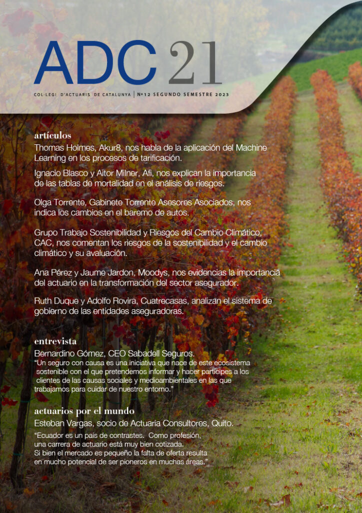 El Colegio de Actuarios de Cataluña (CAC) ha presentado la revista ADC 21 correspondiente a la edición del segundo trimestre del año. En este número se podrán encontrar artículos sobre el Machine Learning, las tablas de mortalidad y longevidad con un enfoque práctico, cuestiones relacionadas con los informes periciales o el sistema de gobierno de las entidades aseguradoras. En las páginas también se podrán leer entrevistas a responsables de Bansabadell Seguros y una visión internacional sobre la profesión de actuario en Ecuador.