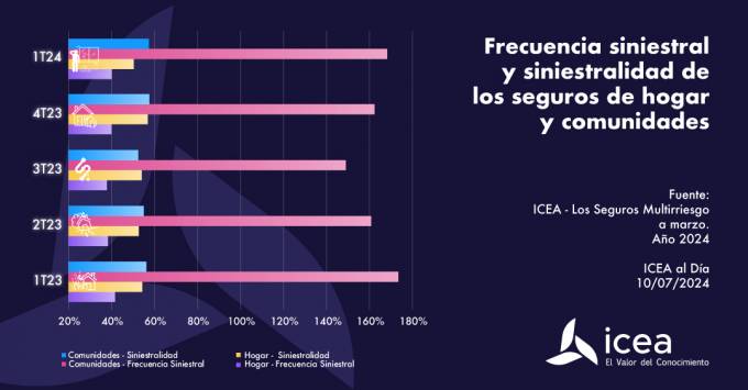 ICEA, a través de su informe 'Los Seguros Multirriesgo a marzo. Año 2024', ha revelado que la frecuencia siniestral de los seguros de Hogar alcanzó, al cierre del primer trimestre, el 40,1% por cada 100 pólizas, con un importe medio de 326 euros por siniestro. Por su parte, Comunidades eleva su frecuencia siniestral al 168,4%. Por cada 100 pólizas y su importe medio por siniestro se sitúa en los 416 euros.