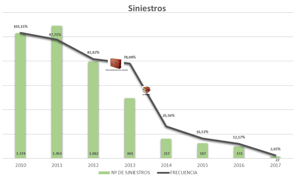 Mutuasport ha informado de que, según sus cifras, se ha producido un descenso de la siniestralidad por responsabilidad imputable a los titulares de los cotos de caza desde la entrada en vigor de la Ley sobre Tráfico, Circulación de Vehículos a Motor y Seguridad Vial. La evolución, con datos desde 2010 hasta 2017 (31 agosto), refleja el descenso de los accidentes de RC de cotos como consecuencia directa de la mencionada Ley. La mutua destaca que "es reseñable cómo afecta la modificación en cuanto al riesgo para los cotos de caza siempre y cuando el accidente de tráfico sea consecuencia directa de una acción de caza colectiva de una especie de caza mayor llevada a cabo el mismo día o que haya concluido 12 horas antes de aquél". Entonces la responsabilidad recae sobre el titular del aprovechamiento cinegético o del propietario del terreno. En los siniestros con intervención de animales salvajes, las especies cinegéticas del jabalí o el corzo son lo que protagonizan mayor número de accidentes.
