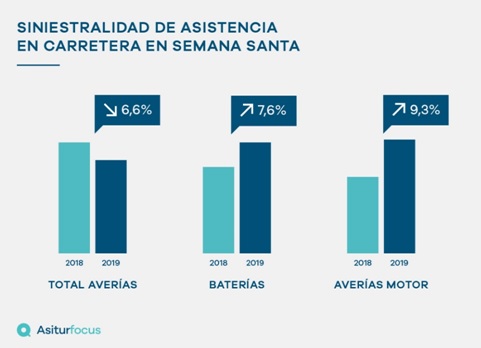La siniestralidad en asistencia en carretera durante esta Semana Santa ha sido menor que la de la Semana Santa de 2018. Según datos analizados por el Observatorio de Siniestros Asitur Focus, se ha producido una disminución de un 6,4% en los servicios gestionados por Asitur.