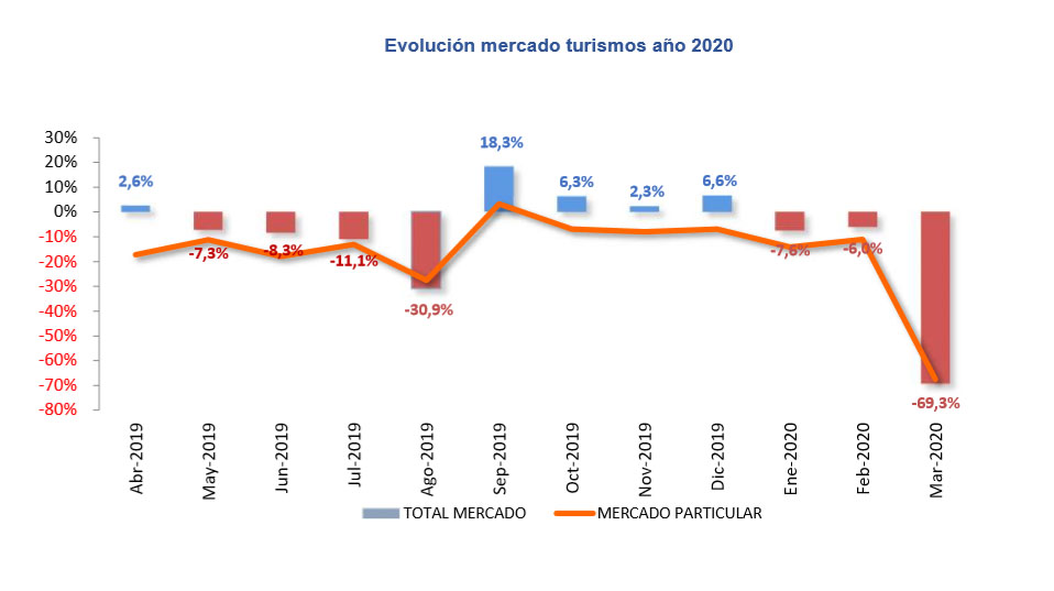 El cierre total de la distribución y comercialización de vehículos desde el pasado 16 de marzo, por la expansión de la pandemia del coronavirus y las restricciones del estado de alarma, ha supuesto, como era de esperar, un grave mazazo a las matriculaciones, colocando las cifras de marzo por debajo del nivel de los peores meses de la crisis económica. Todos los segmentos recortan sus ventas, pero las ventas de turismos y vehículos comerciales ligeros pierden casi dos tercios de sus ventas habituales. En el caso de los turismos, se ha pasado de comercializar una media de 4.500 unidades diarias a registrar jornadas con 200 entregas.