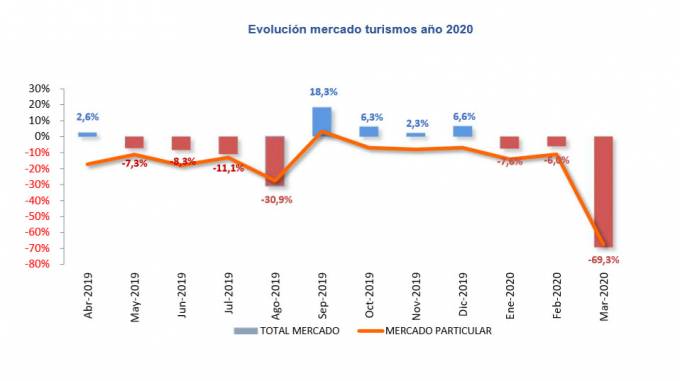 La crisis del coronavirus ha hundido aún más el mercado de turismos que ya venía tocado a lo largo del año. En marzo la caída ha sido de un 69,3% y se han matriculado tan solo 37.644 unidades, según datos facilitados por Anfac.