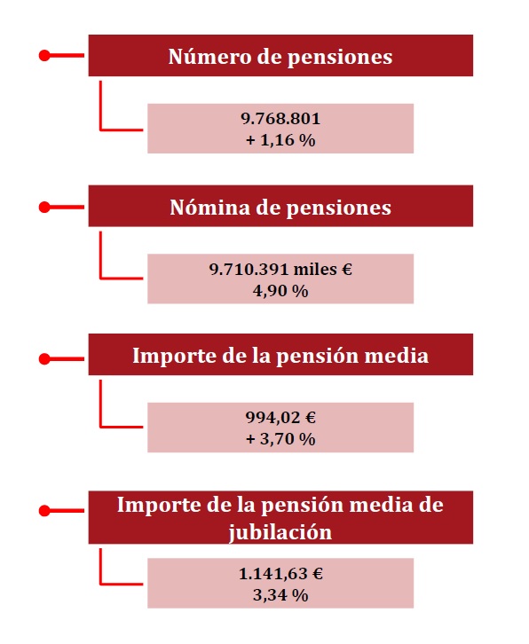 En cuanto a la nómina de las pensiones supera los 9.700 millones de euros. La pensión media de jubilación, se sitúa en 1.141,63 euros mensuales, mientras que las nuevas altas alcanzan los 1.439,60 euros mensuales.
