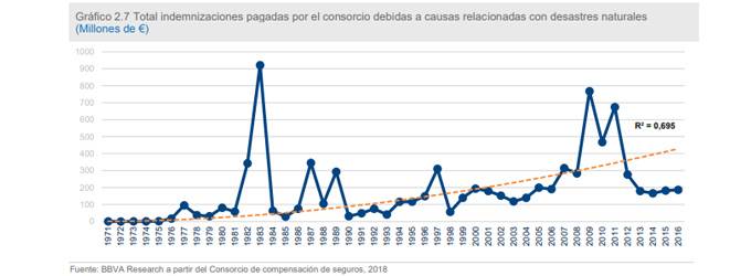 Específica el texto que España cuenta con el Consorcio de Compensación de Seguros (CCS) para cubrir algunos riesgos extraordinarios. Señala que entre 1970 y 2017 este organismo ha indemnizado por valor de 8.429 millones de euros. Según la serie histórica se observa que desde 1971 las indemnizaciones han ido creciendo de forma exponencial hasta el presente.