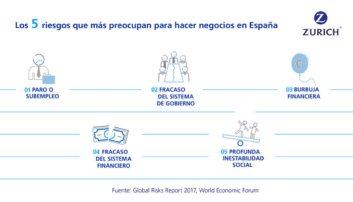 En España, la principal amenaza es el paro, seguida del fracaso del sistema de gobierno, la burbuja financiera, la debilidad del sistema bancario y una profunda inestabilidad social. Son las mismas que las señaladas a nivel europeo, donde además se añade la crisis migratoria.