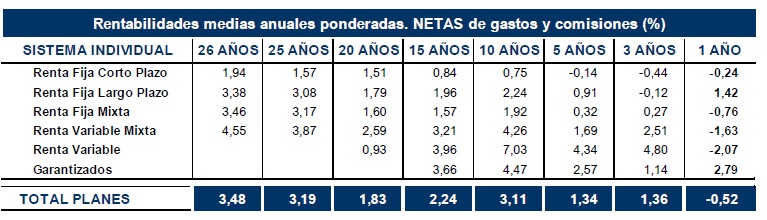 En el largo plazo, los Planes de Pensiones del Sistema Individual registran una rentabilidad media anual (neta de gastos y comisiones) del 3,48% y, en el medio plazo (5 y 10 años), presentan una rentabilidad del 1,34% y del 3,11%, respectivamente.