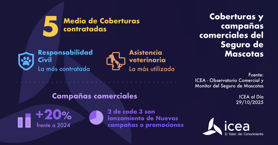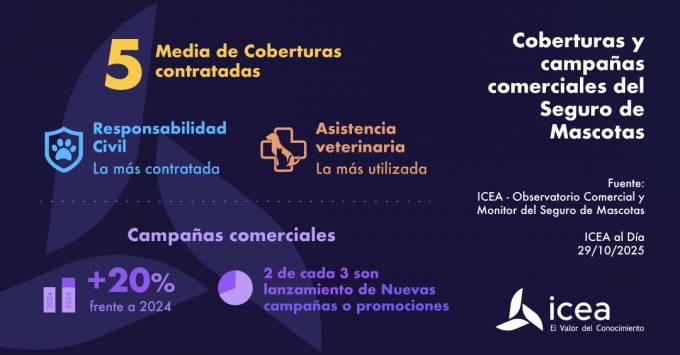 El seguro para mascotas se consolida como una opción popular entre los propietarios de gatos y perros, con la cobertura de RC como la más demandada y la de asistencia veterinaria como la más utilizada por los clientes. Según los datos de ICEA, los asegurados contratan en promedio cinco coberturas, "reflejando una tendencia creciente hacia la protección integral de los animales".