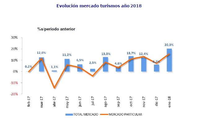 Durante el mes de enero se han matriculado 101.661 vehículos, lo que supone un incremento del 20,3 % en comparación con el mismo mes del año 2017, según datos de Anfac. El tirón viene a través de los canales de empresa y del alquiler, y las cifras ya se equiparan a las de 2008. Este importante incremento se explica porque las empresas están comenzando a renovar sus flotas de cara al inicio de la temporada alta turística, marcada por la Semana Santa, y que este año se celebra a finales del mes de marzo.