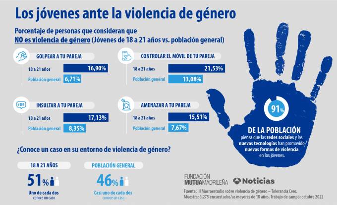 Preguntados sobre determinadas conductas que pueden ser consideradas violencia de género, entre las personas de entre 18 y 21 años un 16,9% cree que golpear a tu pareja no lo es (cuando la media entre la población general está en un 6,71%). Además, un 17,13% considera que insultar a tu pareja no es una forma de maltrato (frente al 8,35% de la población general), mientras que un 15,51% cree que amenazar tampoco lo es (frente al 7,67% de la población general). Asimismo, un 21,53% cree que controlar el móvil no es una forma de ejercer violencia sobre la pareja (frente al 13,08% de la población en su conjunto).