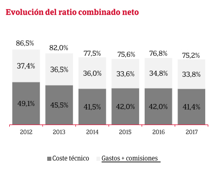 primas en España, del 6,2% por efecto de la política de adecuación de los precios al entorno de siniestralidad: "Se reconducen las tasas a niveles previos a la crisis de 2007". Una siniestralidad del 41% (con un ratio combinado del 75,2%), "indica presión a la baja en precios tanto en cartera como en nueva producción", apunta Arregui.Para 2018, Arregui espera crecer también en facturación en este ramo por encima del PIB pese a la presión en precios, "que va a seguir produciéndose este año por el entorno de baja siniestralidad que atravesamos". También ha anunciado que en 2018 el grupo va a ceder al reaseguro 2,5 puntos menos que en el ejercicio 2017.