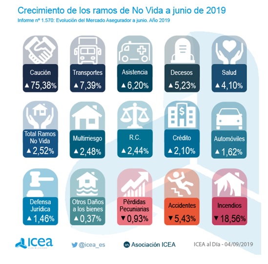 El volumen de primas estimado en los ramos del resto de No Vida (los distintos a Automóviles, Salud y Multirriesgos) a junio de 2019 se sitúa en torno a los 4.787 millones de euros, lo que supone un crecimiento anual del 2,22%. De este conjunto de ramos, ha sido Caución el que más ha crecido con un 75,38%.