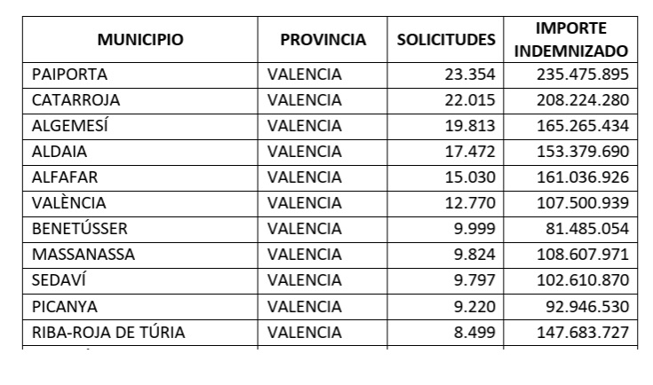 También sobrepasan los 100 millones en indemnizaciones los municipios de Aldaia, Alfafar, Valencia, Massanassa, Sedaví y Riba-Roja de Turia.
