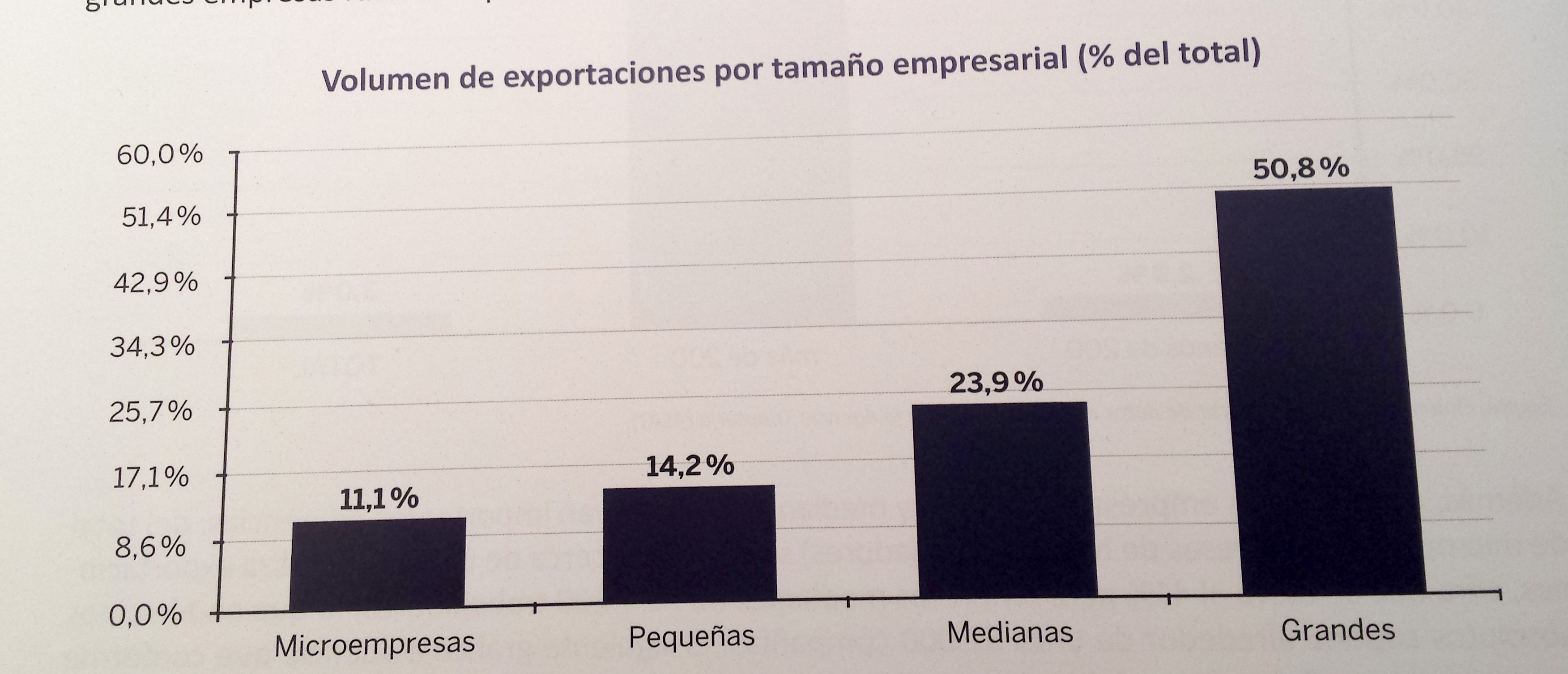En términos de volumen, la micropymes exportaron el 11% del total, las pequeñas empresas el 14% y ya las medianas suben hasta el 24%.