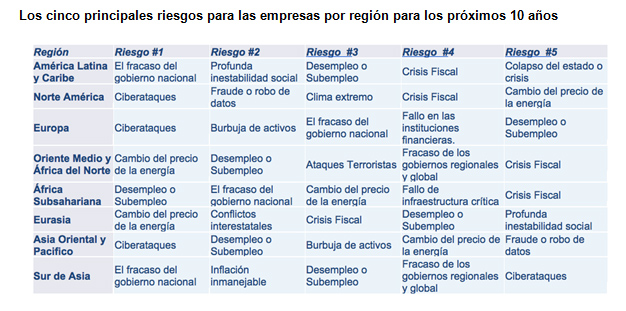 El 'Informe de Riesgos Regionales para Empresas' del Foro Económico Mundial recoge diferencias significativas en las percepciones de riesgo en ocho regiones del mundo. Los más de 12.000 ejecutivos que participaron en la encuesta destacaron diferentes preocupaciones económicas, políticas, sociales y tecnológicas. Entre las principales están el desempleo, el fracaso de los gobiernos nacionales y el cambio en los precios de la energía.