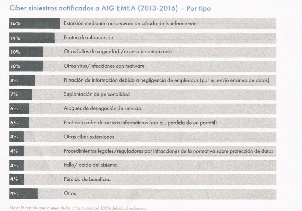 AIG en la región EMEA (Europa, Oriente Medio y África) ha llevado a cabo un análisis para dar a conocer las principales causas de los cibersiniestros. Según explica, con motivo del desarrollo del Internet de las cosas (IoT), se están produciendo cibersiniestros como grandes filtraciones de datos y ataques distribuidos de denegación de servicio (DDoS) cada vez más sofisticados. No obstante, la ciberextorsión en su modalidad de ransomware (secuestro de información) es uno de los ciberdelitos que, según destaca el análisis de AIG EMEA, entre 2013 y 2016 más rápido ha ido creciendo, hasta alcanzar el 16% del total de cibersiniestros notificados a la compañía durante ese período.