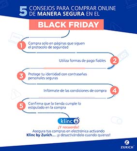 Muchos internautas españoles tienen previsto realizar alguna compra on-line en el próximo Black Friday o el Cyber Monday. Zurich da cinco consejos para comprar por Internet de forma segura: comprar solo en páginas seguras; pagar de forma segura; proteger la identidad; leer bien la descripción del producto y las condiciones de venta y envío antes de comprar; tras realizar el pago, revisar que se haya cobrado el importe correcto en la tarjeta.