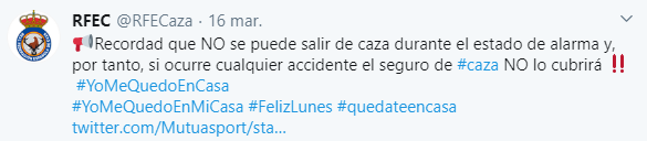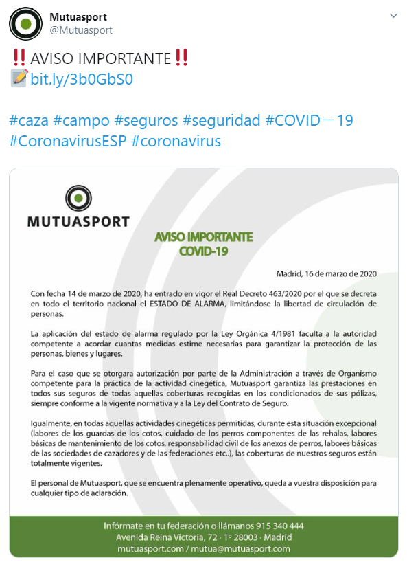 A los dos días de declarase el estado de alarma, Mutuasport publicó en su página web y en sus redes sociales un comunicado en el que advertía a sus asegurados de que no cubriría a quienes vulnerasen las normas y se saltasen, por tanto, las restricciones de libertad que conlleva este escenario extraordinario. "La cobertura del seguro es inherente a la práctica de la actividad cinegética, sujeta ésta a la normativa legal. El seguro de Mutuasport ofrece coberturas en todas sus pólizas siempre y cuando la actividad se desarrolle en cumplimiento de la vigente normativa. En caso contrario, el infractor asume un riesgo, así como una responsabilidad personal", nos precisan en la mutua.