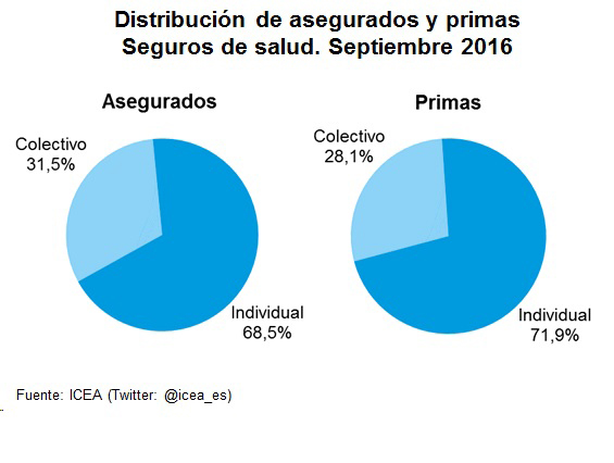 Al término del pasado mes de septiembre los seguros colectivos de Salud doblaron en crecimiento a los individuales tanto en primas como en asegurados, según ICEA. Los individuales supusieron un 71,9% de la recaudación y un 68,5% de los asegurados; en cuanto al crecimiento, los seguros colectivos crecieron un 8,6% en primas frente a un crecimiento del 3% de los seguros individuales.