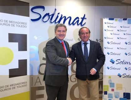 Ángel Nicolás García, director gerente de Solimat, y José Enrique García Mérida, presidente del Colegio de Toledo, han firmado un convenio de colaboración que, según ha explicado García Mérida tiene, entre objetivos, defender la institución de la mediación y dar un servicio al mediador. "Queríamos hacer acuerdos no solo técnicos con empresas más relacionadas con nuestro sector como aseguradoras, sino también abrir el Colegio a otro tipo de empresas, instituciones para acercar, a los 60 colegiados que lo forman, información relevante para ellos". En este sentido, ha destacado la realización de la jornada que se celebrará el próximo 13 de marzo sobre los nuevos cambios legislativos para el colectivo de autónomo, de gran interés para el colectivo de colegiados ya que muchos son empresarios autónomos.