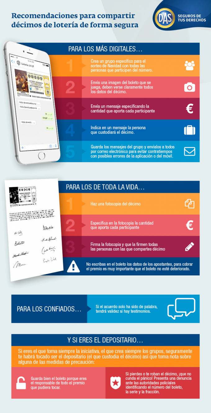 Los expertos legales de DAS Seguros aportan las claves necesarias para compartir la lotería a través de Whatsapp: crea un grupo específico para compartir cada décimo; envía una imagen del boleto que se juega; explicita quién custodiará el décimo; y guarda los mensajes del grupo. En el caso de compartirlo por métodos más tradicionales los consejos legales son: efectuar un documento-contrato en el que todos los participantes firmen que están compartiendo décimos de lotería de Navidad para el sorteo del 22 de diciembre de 2018; en el caso de hacerlo de forma más casera, es necesario que en un documento conste la identidad y firma de la persona depositaria del décimo, el importe de la participación, el número/serie/fracción del décimo, así como la fecha del sorteo.