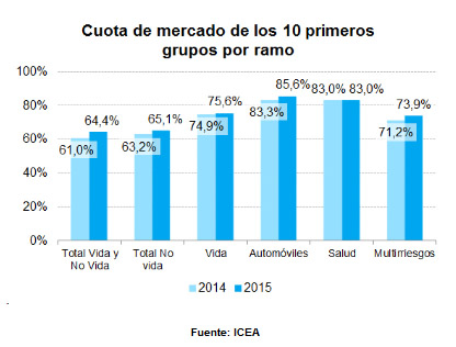 Los datos de 2015 demuestra que la concentración del sector asegurador se ha incrementando un 4,4% respecto a 2014. Los datos de ICEA señalan que los 10 primeros grupos por primas acaparan el 64,4% del total del mercado frente al 61% que poseían un año antes. En No Vida la concentración aumenta casi un 2% al pasar del 63,2% al 65,1% de los principales grupos.