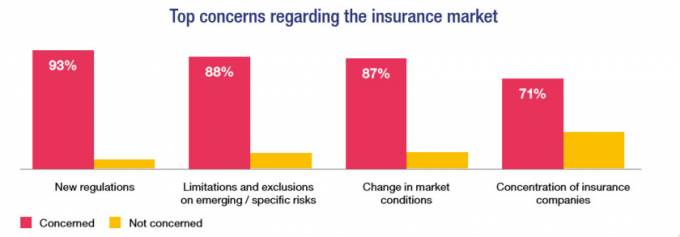El informe de Ferma en relación a países como España también publica cuáles son las principales preocupaciones sobre el sector asegurador. En este sentido los encuestados muestran en primer lugar las nuevas regulaciones (93%), seguido de las políticas de limitaciones y exclusiones (88%) o las condiciones cambiantes del mercado (87%). En cuarto lugar aparece la concentración del sector; este aspecto es preocupante para el 71% de los encuestados.
