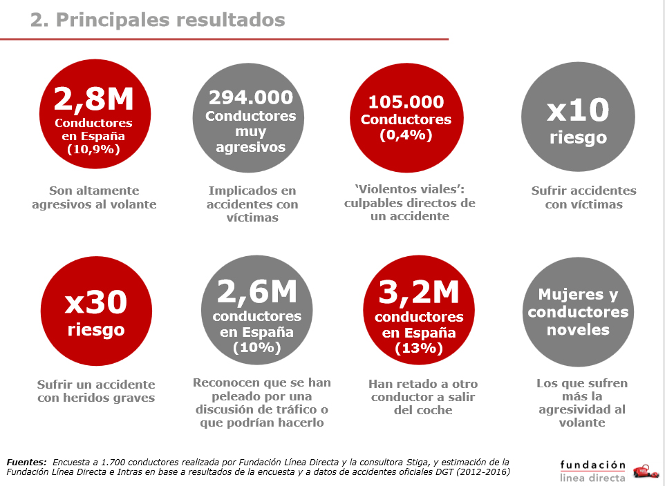 Según las conclusiones de la fundación e Intras y aplicando un factor de agresividad de acuerdo a los criterios de la Organización Mundial de la Salud ha habido "31.000 conductores con alta agresividad implicados en 28.600 accidentes con víctimas" durante 2016.