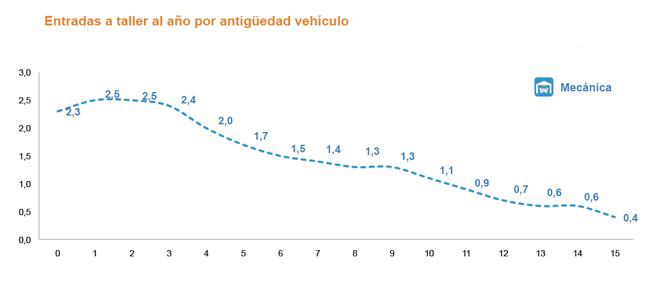 La tendencia por parte de los conductores a limitar la visita al taller a encuentros esporádicos donde la reparación sea imprescindible para poder seguir circulando, se agudiza a medida que avanza la edad del coche. Cuando cumple 15 años las visitas por el taller se espacian y pasan a hacerse 1 vez cada 2 años.