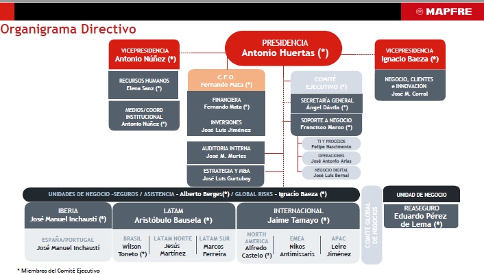 Se incorporan al comité ejecutivo, máximo órgano de dirección de la compañía en el mundo, Aristóbulo Bausela, CEO territorial Latam, Fernando Mata, nuevo director general corporativo financiero y CFO, Elena Sanz, directora general corporativa de RRHH, Jaime Tamayo, CEO territorial Internacional, y Wilson Toneto, CEO de Mapfre Brasil y Alberto Berges, CEO de la Unidad de Asistencia.