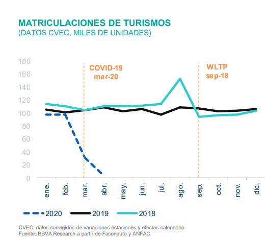 Sin pandemia se hubieran matriculado sobre 190.000 vehículos más en marzo y abril. Las ventas, en un escenario central, se reducirán en torno al 40% este año hasta los 765.000 turismos. Para el próximo año, y gracias a la recuperación económica y el descenso de la incertidumbre, las matriculaciones podrían superar los 1,1 millones de unidades, un 9% inferior a 2019. Si el escenario se complica las ventas estarían por debajo de 700.000 unidades.