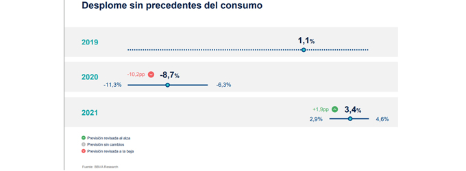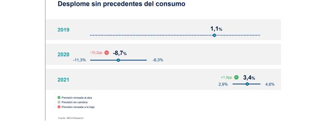 BBVA Research ha publicado el informe 'Situación Consumo 1S20' donde hace previsiones sobre la economía española. El consumo, según sus cálculos registra un "desplome sin precedentes del consumo". Sus estimaciones apuntan a que este año el consumo de los hogares caerá hasta un 8,7%, después de un crecimiento del 1,1% en 2019. El centro de estudios señala que al siguiente año, en 2021, el consumo crecerá un 3,4%.
