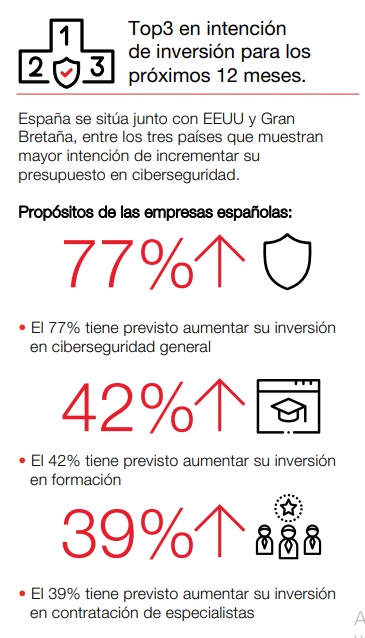 España ocupa el Top3 en intención de inversión para los próximos 12 meses, junto con EEUU y Gran Bretaña. Estos son los tres países cuyas entidades analizadas muestran mayor intención de incrementar su presupuesto. En el caso de las empresas españolas, el 72% aumentará su inversión en ciberseguridad general, el 42% en formación interna y el 39% en contratación de profesionales especializados.
