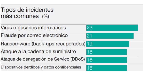 Sobre los incidentes más comunes, en primer lugar, figuran los virus o gusanos que suponen el 23% de los ataques, seguidos del fraude en el correo electrónico (21%) y el ransonware el 19%.