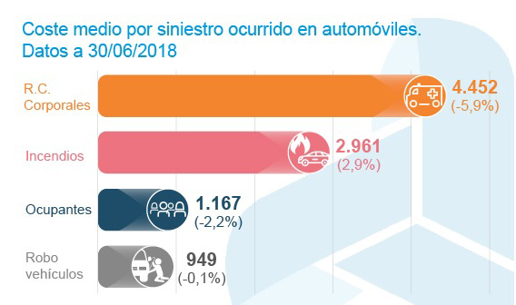 A junio de 2018, las garantías con costes más elevados en Autos son las de RC Corporales, con un importe medio de 4.452 euros (un 5,9% anual menos), seguida de la garantía de Incendios, con un coste medio de 2.961 euros (un 2,9% más) y de la de Ocupantes y Robo de vehículos. El resto de garantías analizadas presentaron variaciones que oscilaron entre el alza de 3,2% de Rotura de Lunas y el descenso de 8,4% de Retirada del Carnet, según datos de ICEA.
