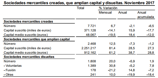 Además, en noviembre ampliaron capital 2.468 sociedades mercantiles, un 7,3% menos. El capital suscrito en las ampliaciones se incrementó un 28,5%, hasta los 2.251 millones de euros, y el capital medio suscrito en estas operaciones lo hizo un 38,7% (912.162 euros).