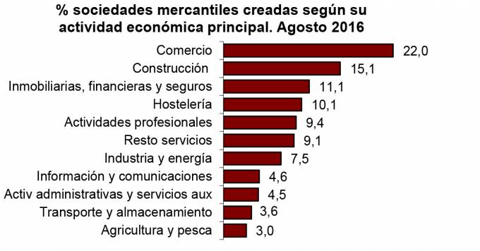 Por sectores, el 22% de las sociedades creadas correspondió a Comercio y el 15,1% a Construcción. El apartado en el que el INE incluye juntas a inmobiliarias, financieras y seguros acaparó el 11,1% de las nuevas empresas. También fueron las sociedades de la actividad de inmobiliarias, financieras y seguros las que presentaron el mayor capital suscrito, con 653,22 millones de euros.
